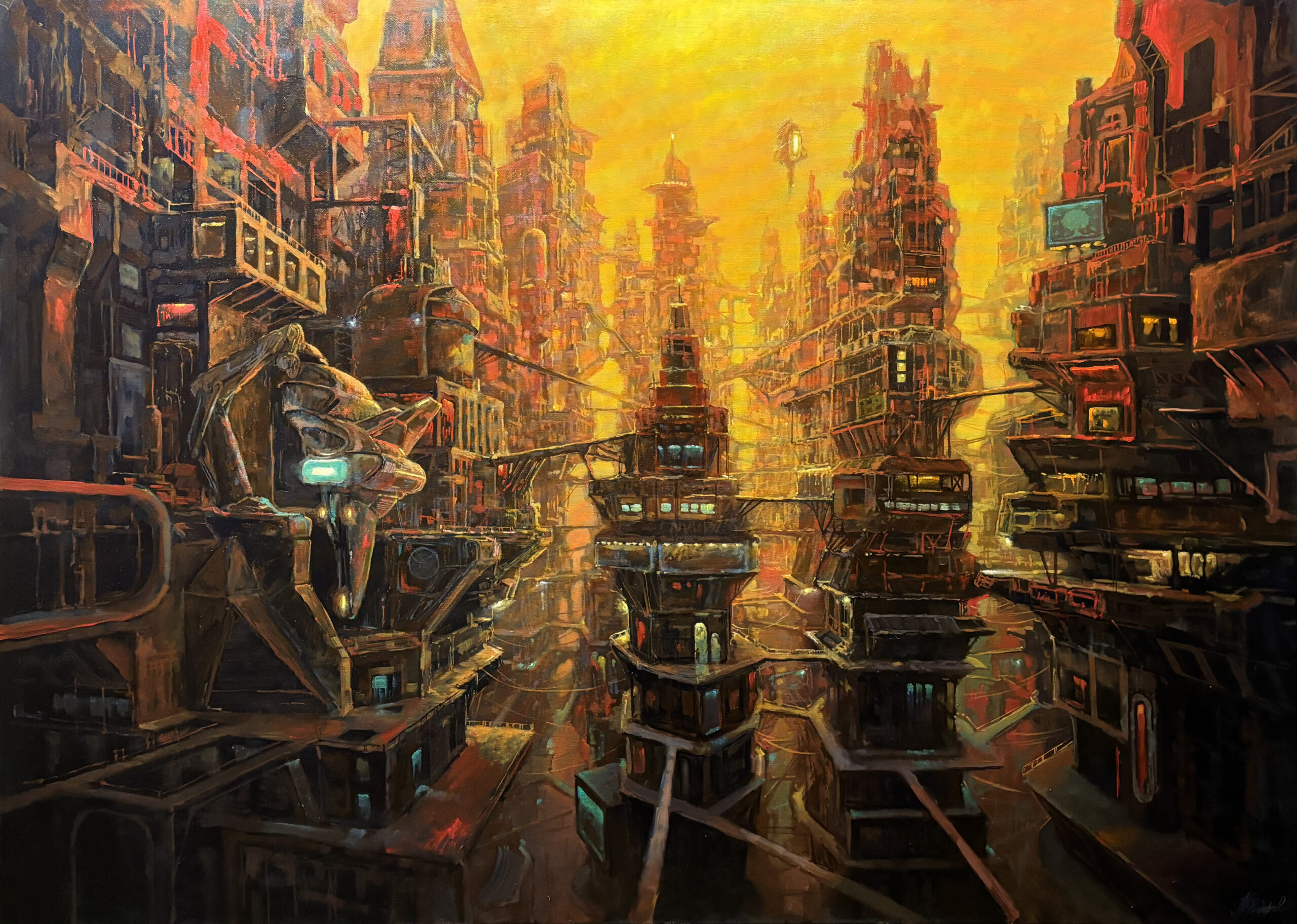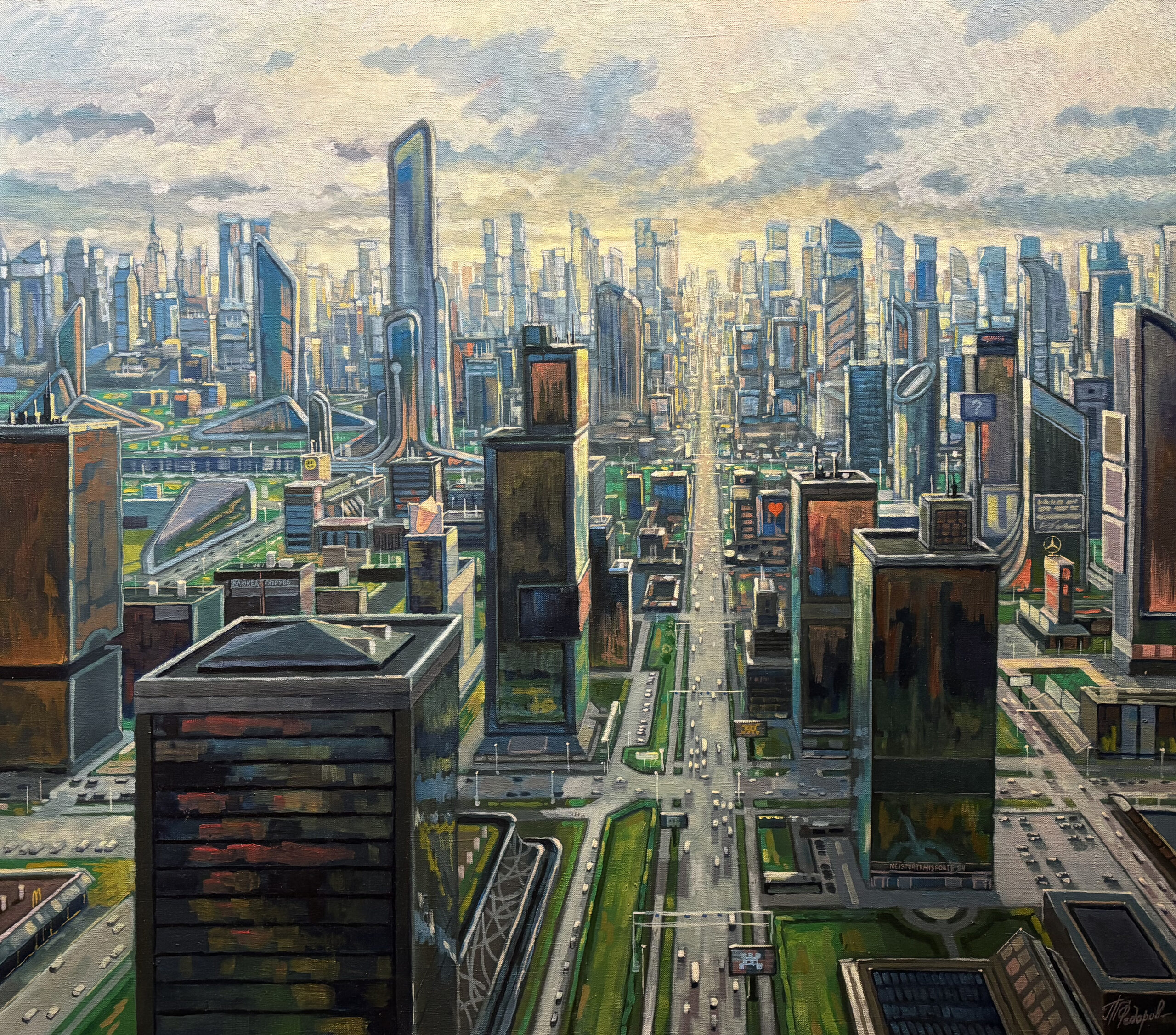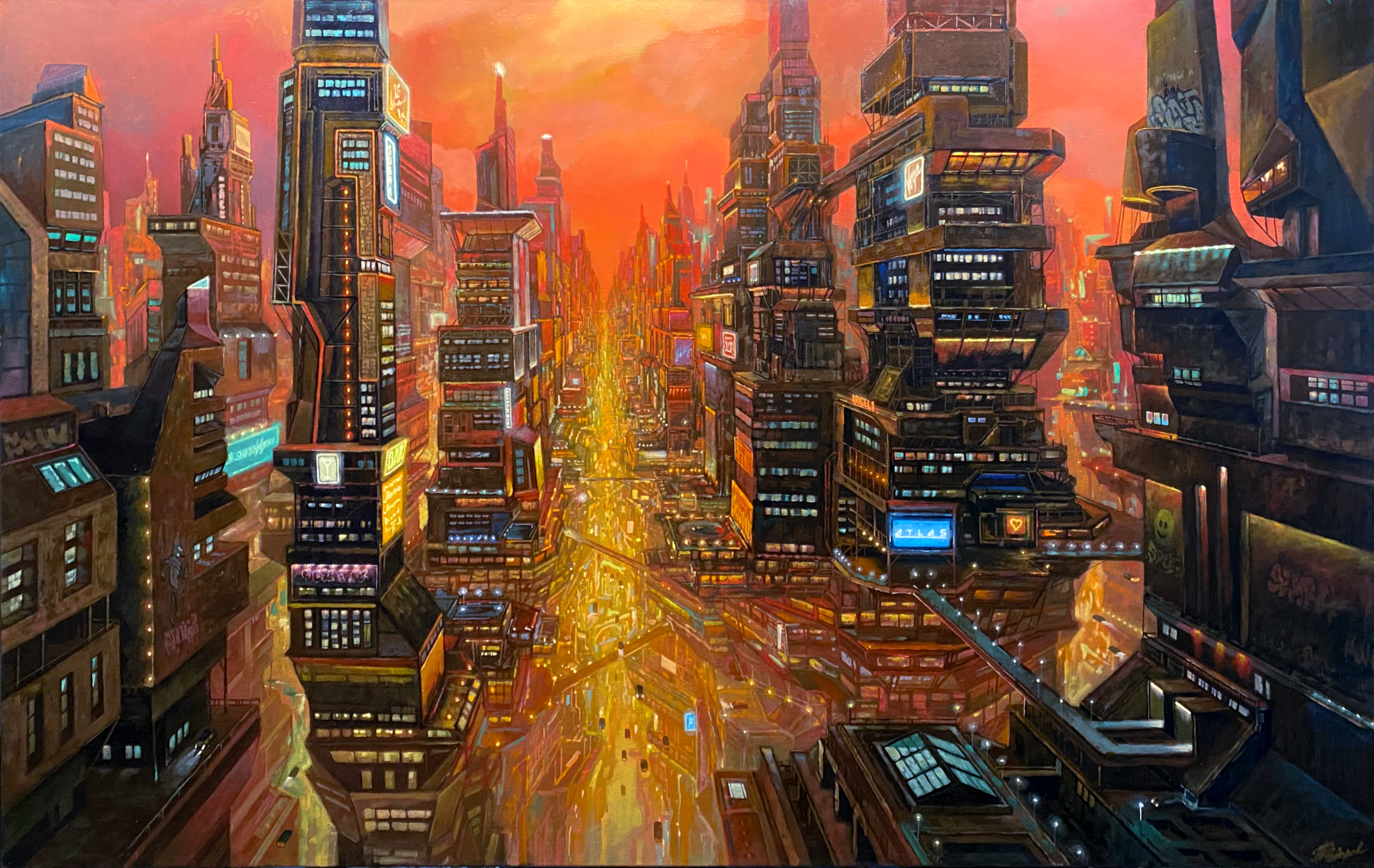 In my oil painting, I capture a futuristic megacity. The pulsating energy and the geometric play of light and shadow reflect