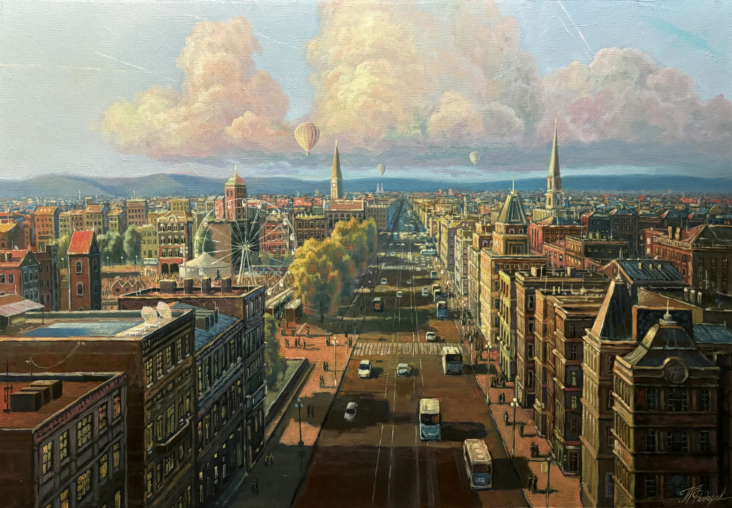 In my work, I painted a fictional English-style city in oil, combining realism with an atmosphere of festivity and warmth.