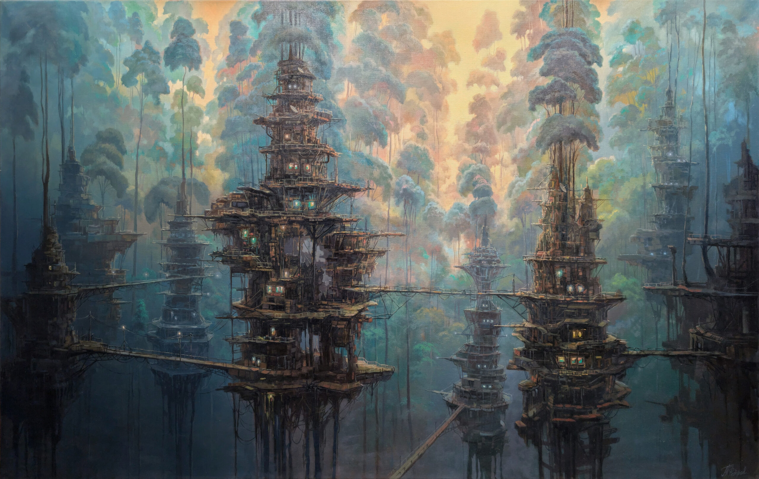 In my painting, I brought a futuristic city to life by means of oil painting. The soaring towers and floating structures