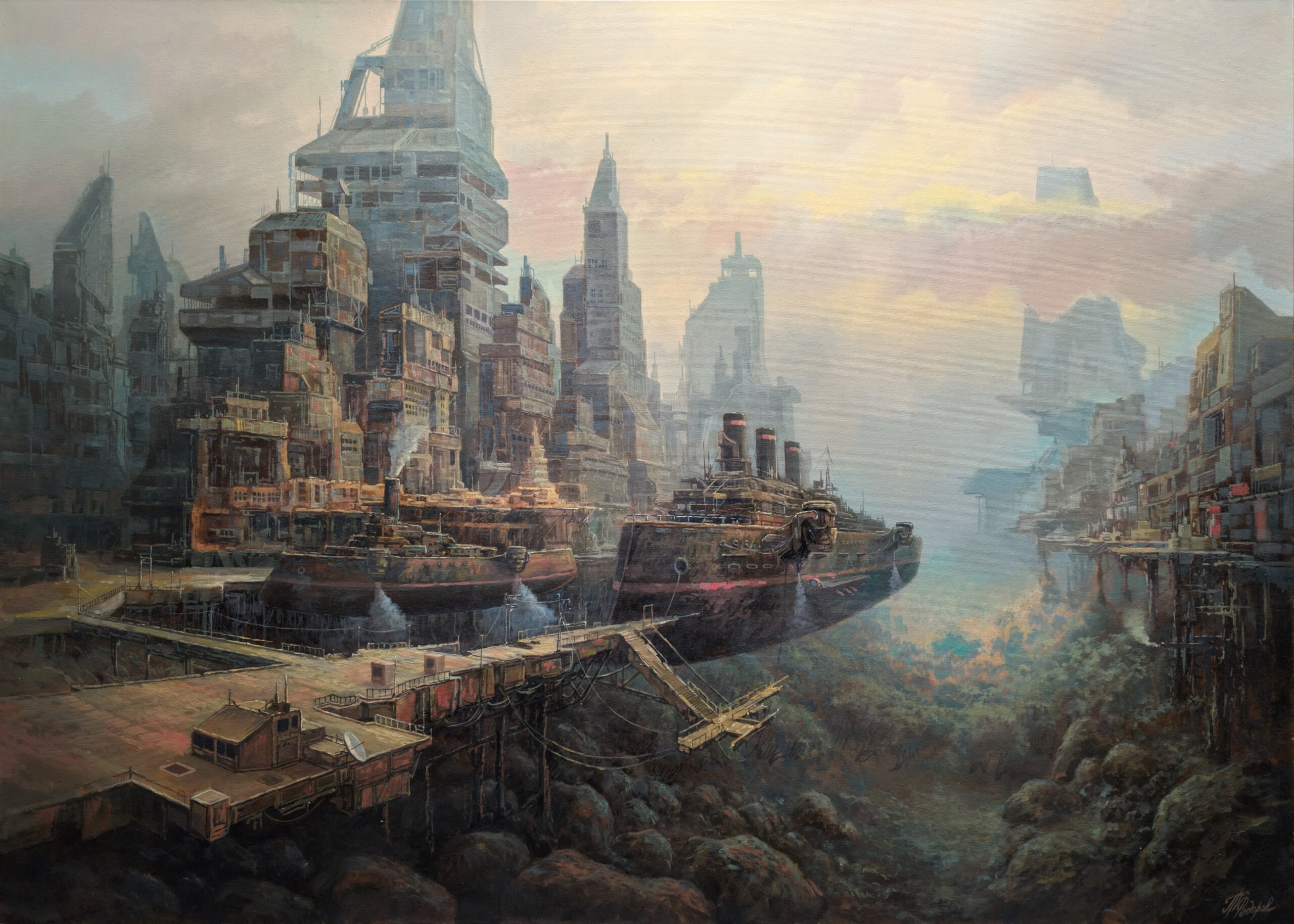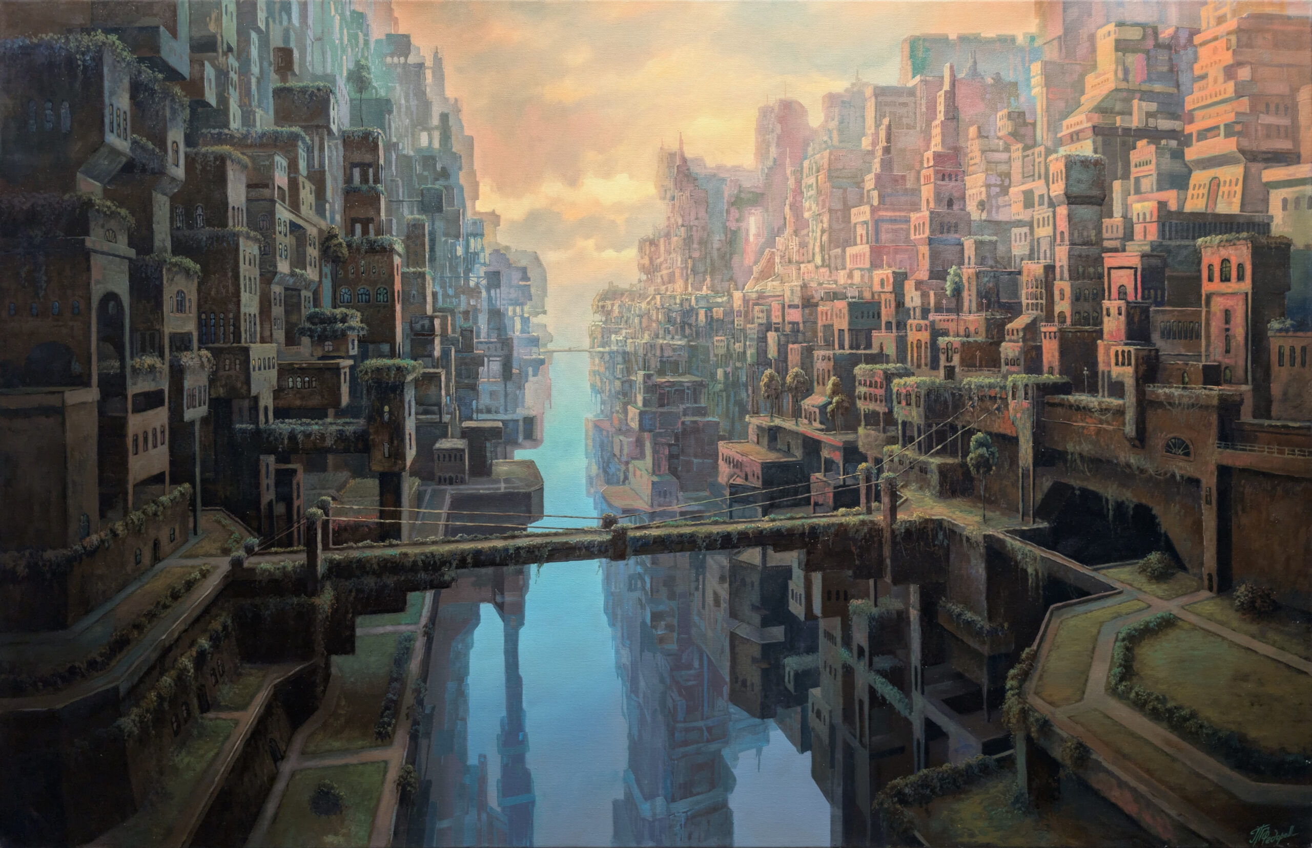 In this work, the boundaries between reality and fantasy merge. I painted a city visionary of the future that depicts both