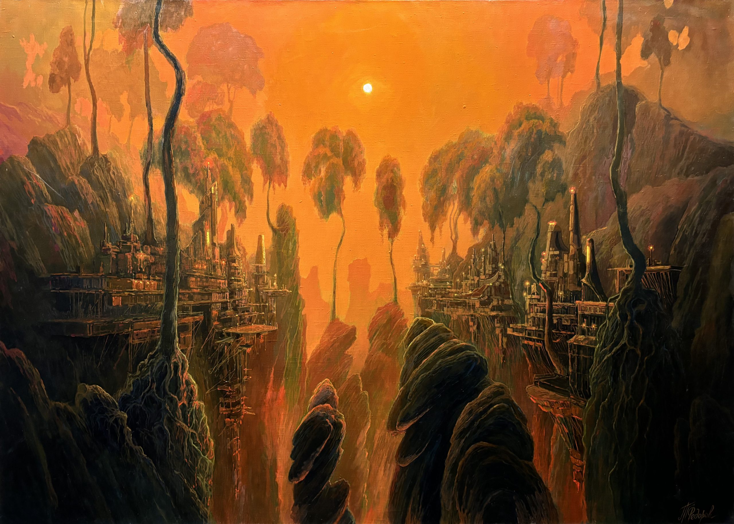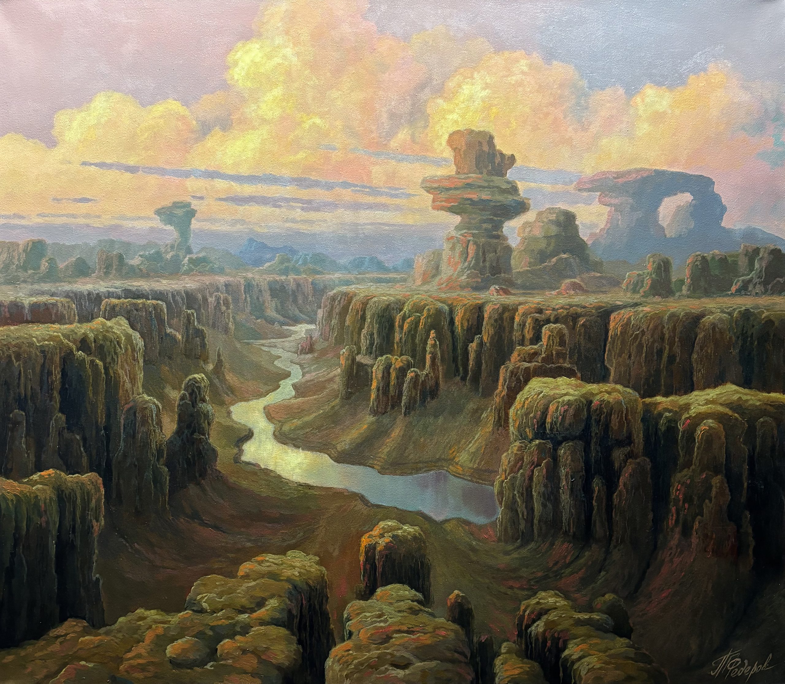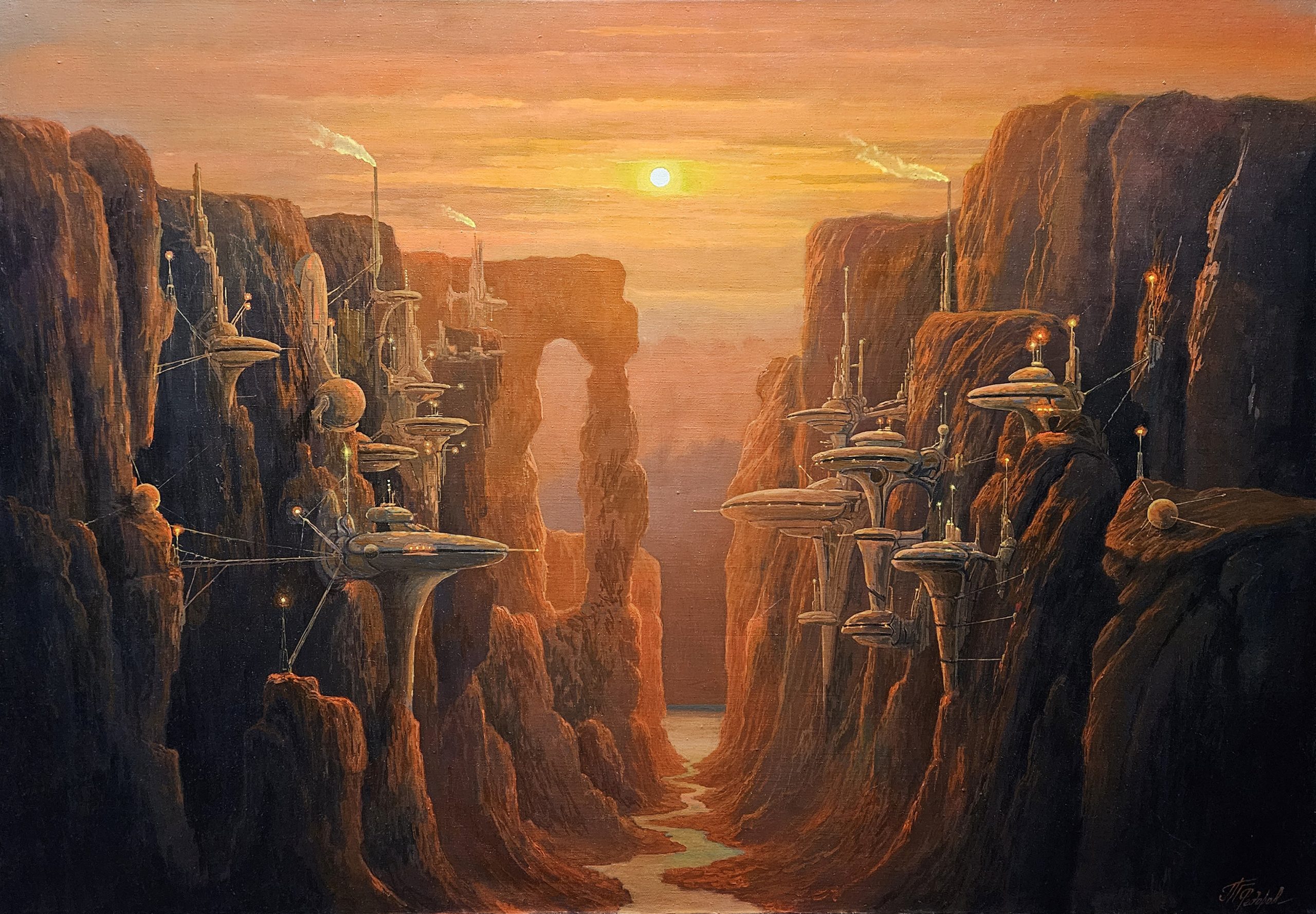 In this piece, I have created a futuristic landscape that is both majestic and challenging. Using oil paints, I shaped steep canyon walls and advanced structures that blend harmoniously into the rugged natural scenery. The sunset in the background adds a warm, hopeful atmosphere. This painting is intended to spark a discussion about the future of our environment and human innovation, bringing an energetic and contemplative mood into any home.