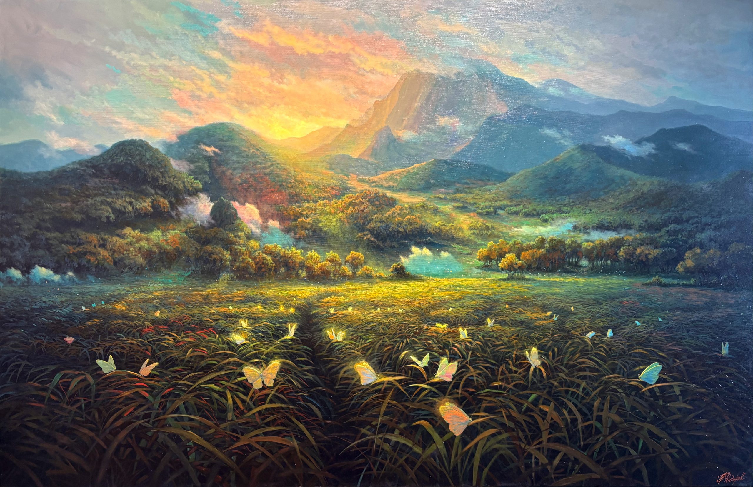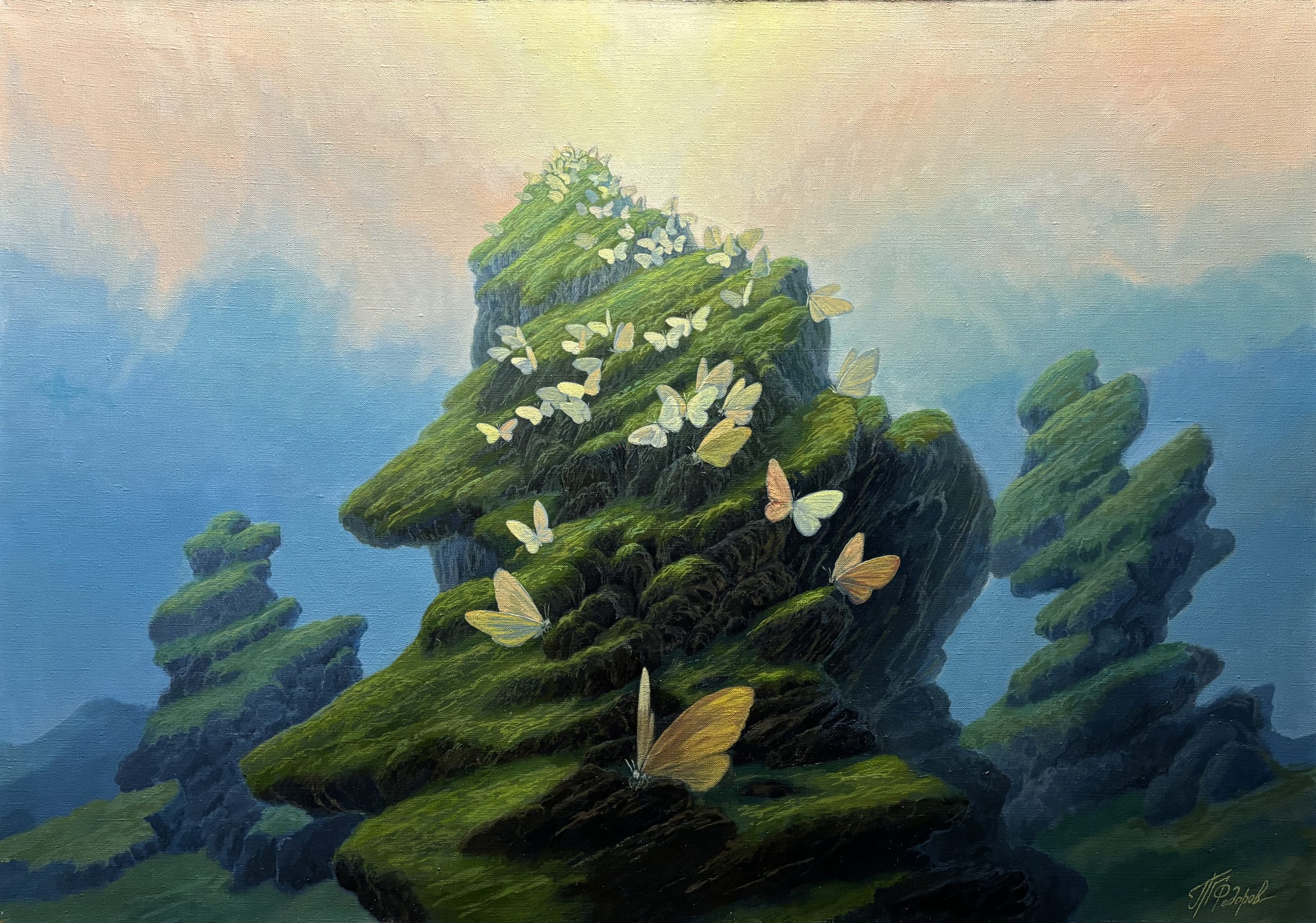 In my work, realism and surrealism merge to explore a world beyond tangible reality. Using oil paints, I have carefully created a series of floating green islands gently surrounded by butterflies. This composition is an invitation to dream and reflect—a peaceful retreat that celebrates the harmony between nature and imagination. The painting brings a calming and inspiring energy into any home.