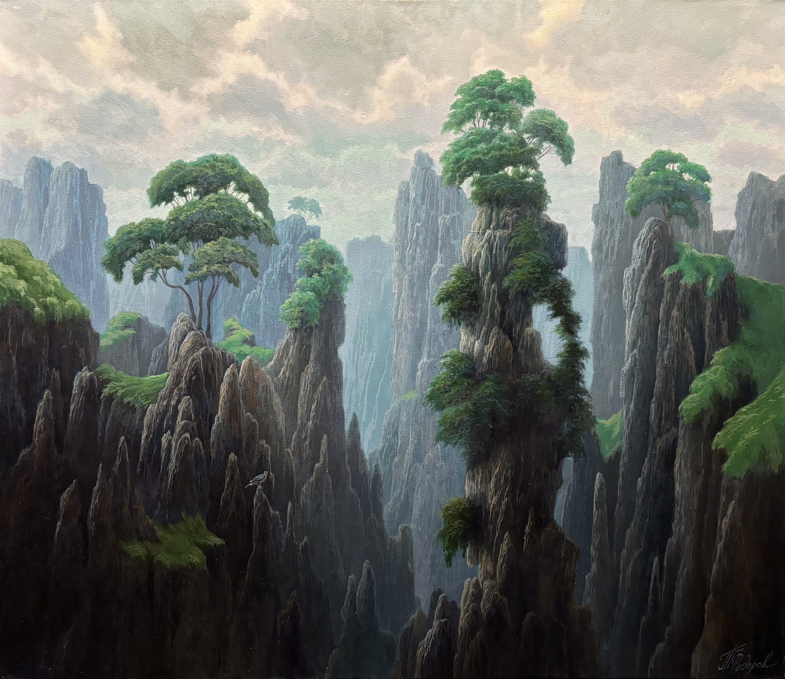 In this oil painting, I intertwine realism and surrealism to create a world beyond ordinary boundaries. The majestic, towering rock formations and the lush trees balancing atop them symbolize both strength and fragility. This artwork is meant to inspire viewers to reflect on the duality of the human experience and to recognize the beauty within the unknown. It radiates an uplifting yet calming energy, adding a deeper sense of meaning to any space.