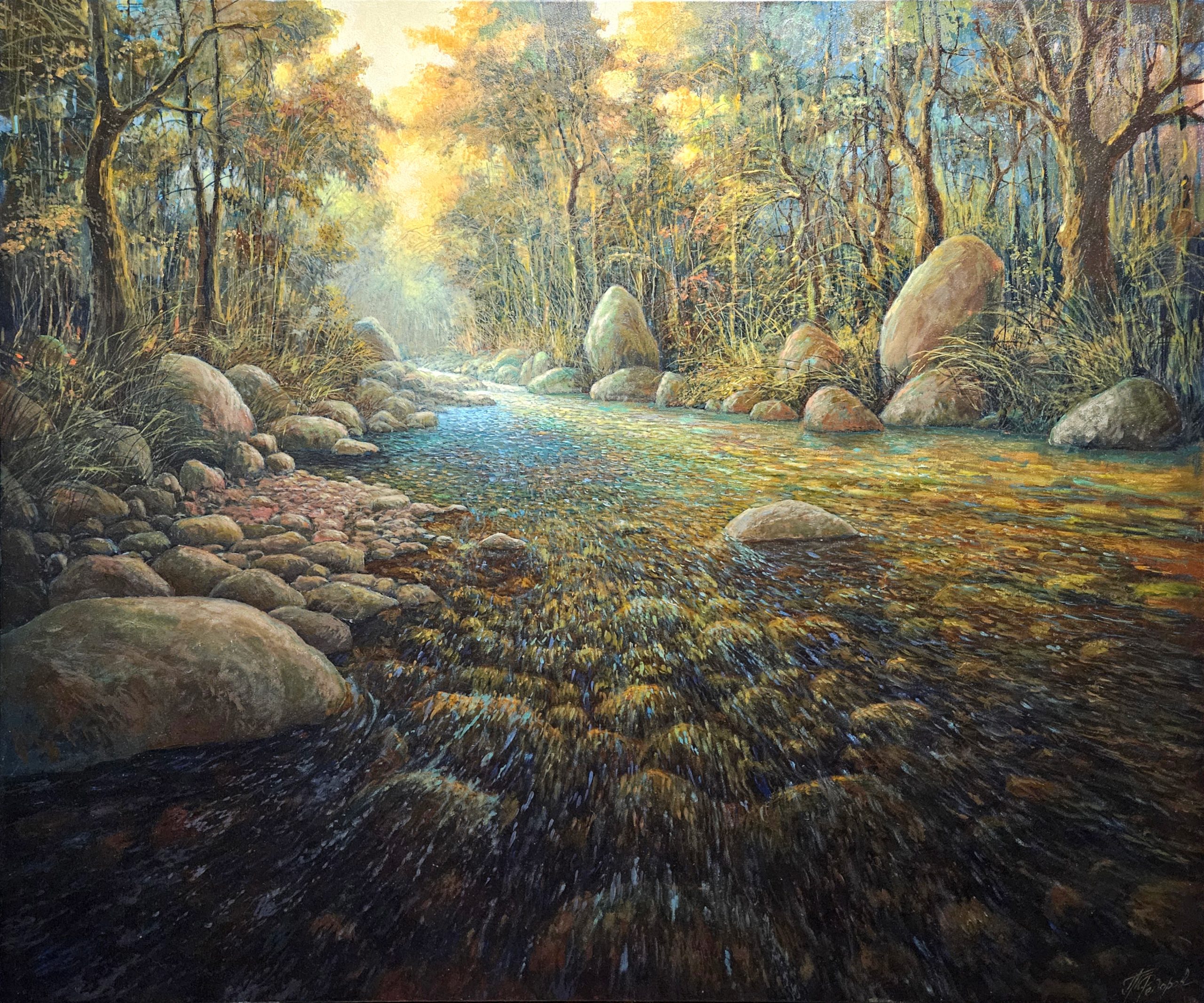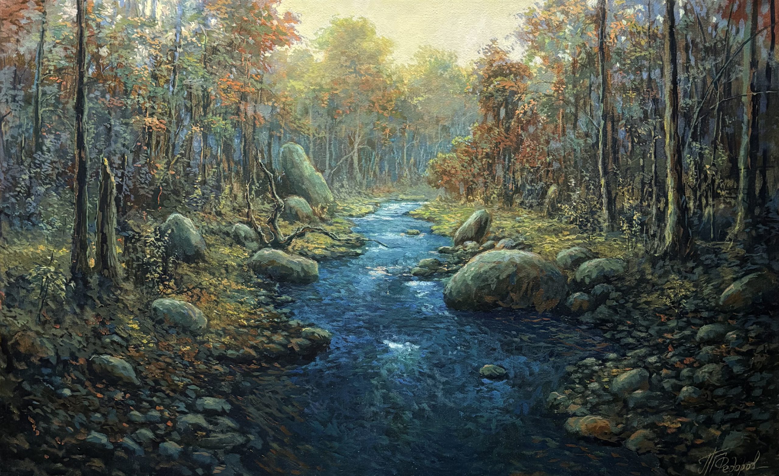 In this work, I used oil paints to convey a deep connection with nature and its pristine beauty. The painting depicts a picturesque forest stream, illuminated by soft sunlight dancing on the water’s surface.