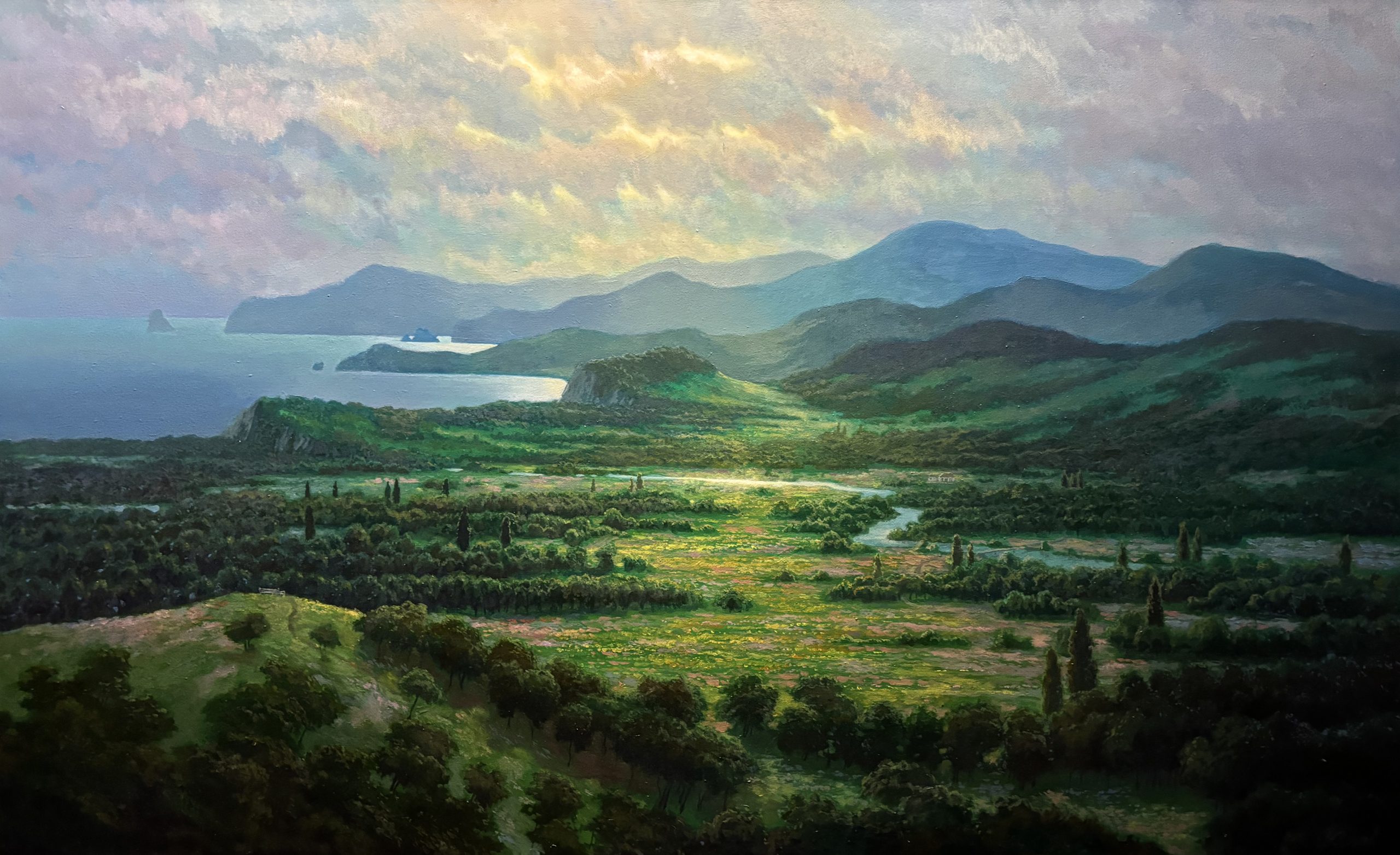 In this oil painting, I blend realism and surrealism to create a landscape that feels both familiar and dreamlike. The smooth transitions from green valleys to the gently curved mountains in the background, along with the dramatically lit sky, capture the elusive beauty of nature. This piece is meant to take the viewer on an emotional journey and bring a sense of peace and wonder into their home.